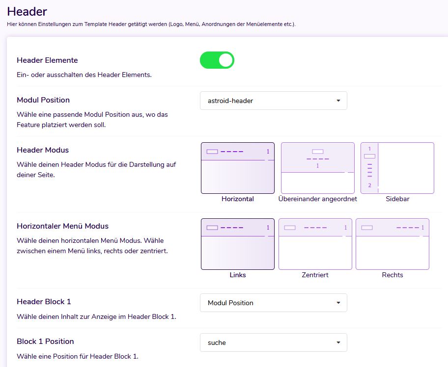Das Konfigurieren des Mega-Menüs in Astroid ist wirklich einfach und unkompliziert. Mit nur wenigen Klicks erhalten Sie ein großartig aussehendes Mega-Menü. Der erste Schritt besteht darin, das Menü zu konfigurieren und das Header-Layout für Ihre Site auszuwählen. Siehe den folgenden Screenshot, in dem ein wenig erklärt wird, wie das Menü im Header aktiviert wird.